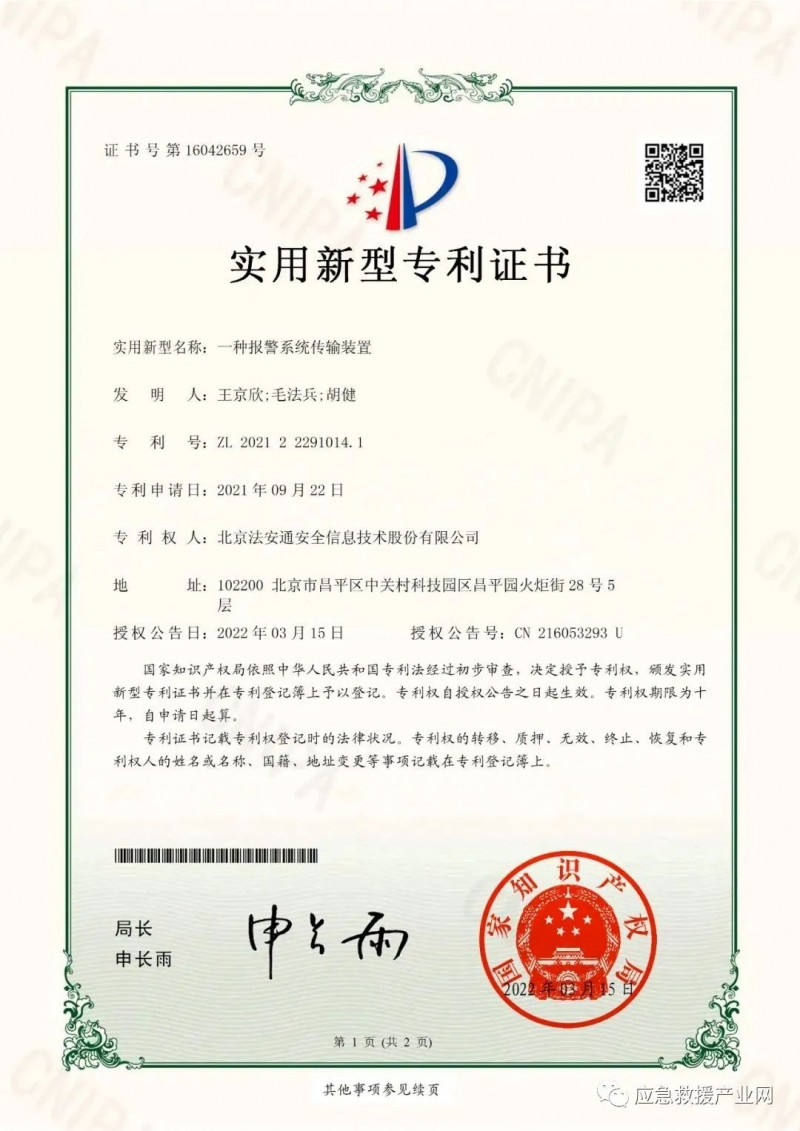 近日,北京法安通安全信息技術(shù)股份有限公司申報的“火災(zāi)探測報警裝置”、“報警系統(tǒng)傳輸裝置”兩項智慧消防前端產(chǎn)品實用新型專利,獲得國家知識產(chǎn)權(quán)局授權(quán)。